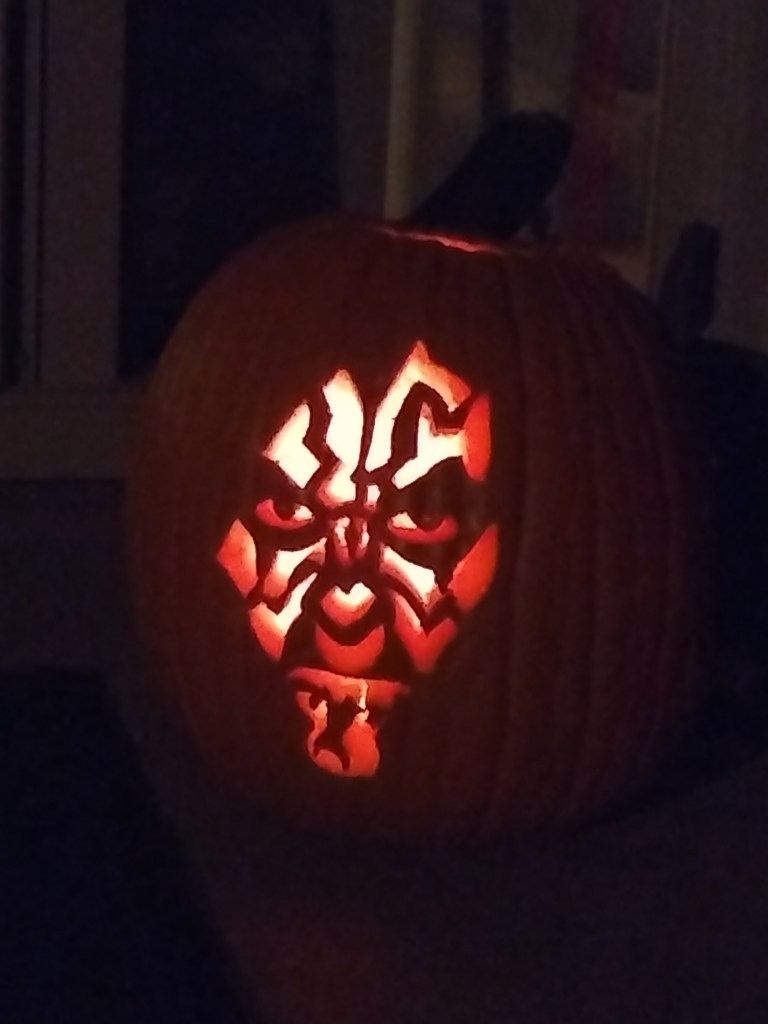 Last night was Halloween, and I got to stay home and pass out candy. Nothing special happened and not very many people came to the front door. although, We did have a party in the basement where we watched the Conjuring. Before hand, we got to carve pumpkins and we bought a tone of candy. We now have a 7 gallon bucket of candy sitting in our kitchen. But back tracking to carving our pumpkins. I carve some kind of character every year and I spend a lot of time trying to make it happen. I have carved star wars characters, dogs, and gymnastics figures before. My favorite would have to be the Darth Maul that I carved 2 years ago.